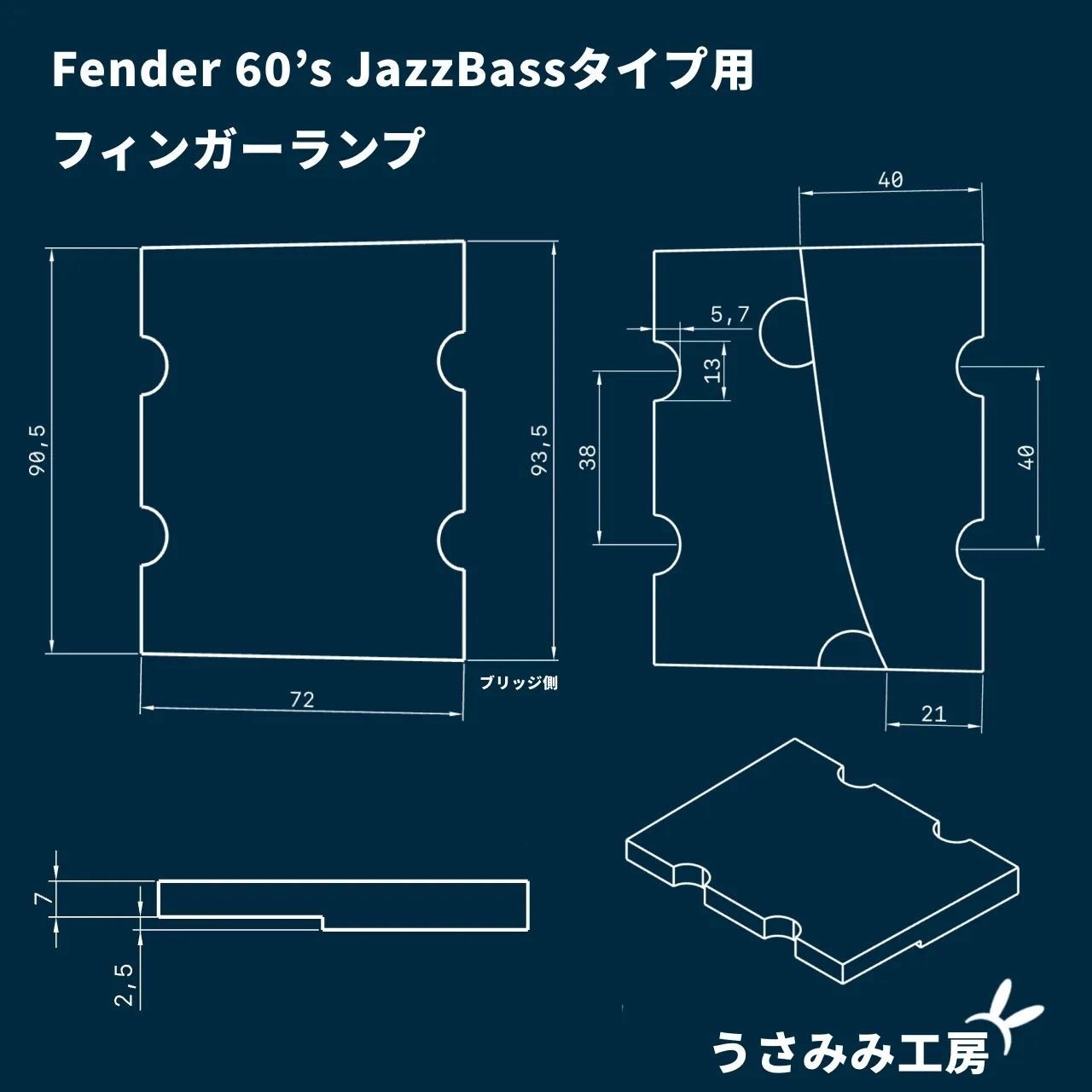 一般的なFender基準のジャズベースに本体加工無しで取り付けることが出来、専用のスペーサーで高さを調整することが出来るフィンガーランプです。