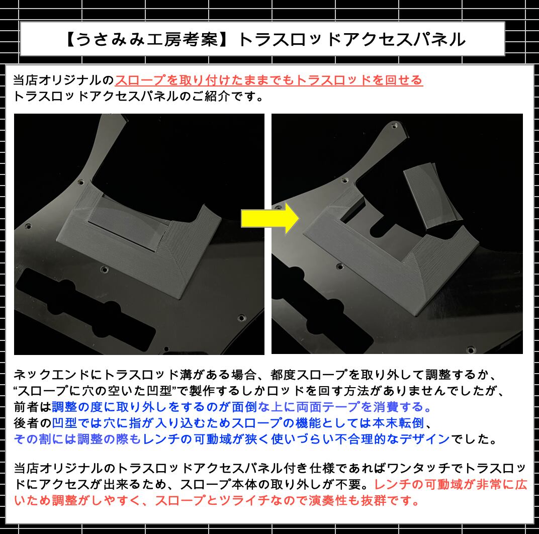個人の好みにはなりますが、形状の特性上 1弦のサムピングとプルには於いて機能しないという弱点がございます。1弦でもスロープとして機能させたい方は当店オリジナルのデザインの物をお勧め致します。